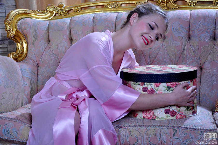 Sexy hottie enjoys trying on various lingerie with matching colored nylons