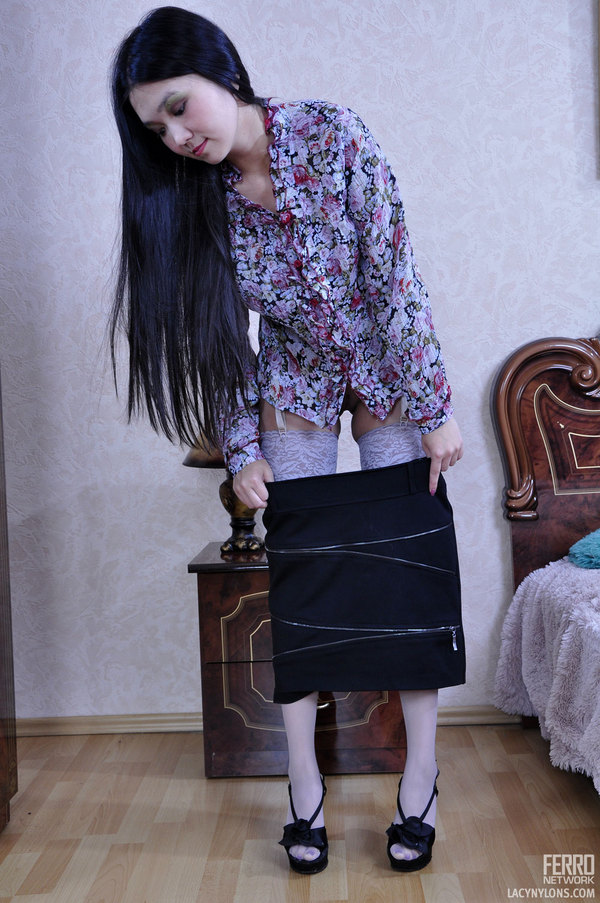Naked Asian cutie puts on a pair of grey stockings with a matching garter