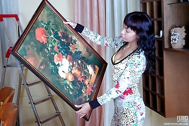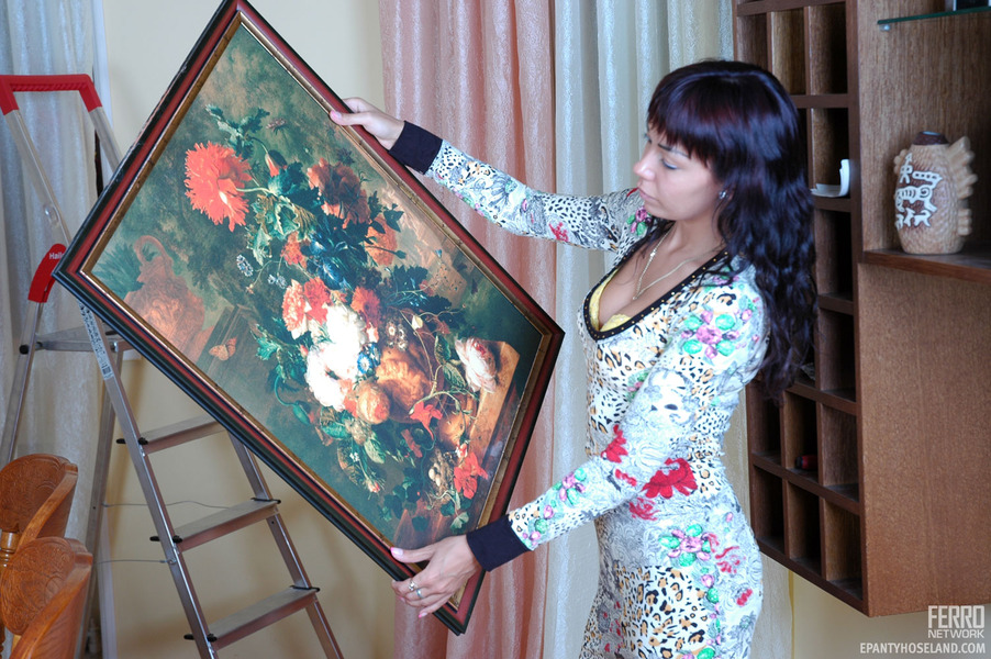Sizzling hot chick hangs a picture before stripping her grey shiny pantyhose