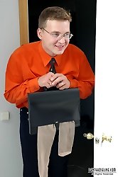 Smoking chick in shiny pantyhose punishing her nylon obsessed subordinate